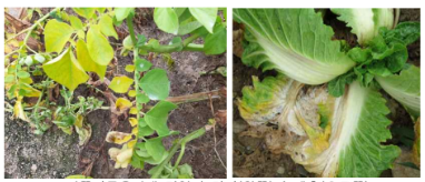 반쪽시들음병에 감염된 감자(왼쪽)와 배추(오른쪽)농촌진흥청은 감자․배추 반쪽시들음병 방제에 효과가 있는 미생물을 선발해 특허출원을 마쳤다고 밝혔다.반쪽시들음병은 토양에 번식하는
