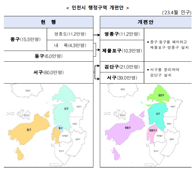 인천시는 생활권 불일치에 따른 주민 불편 해소, 인구·면적 조정을 통한 행정 효율성 향상, 자치구별 특화 발전을 위해 지난 6월 1일 정부에 행정구역 개편을 건의한 바 있다.