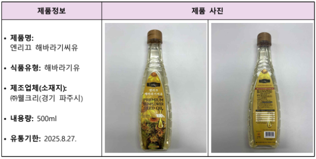 식품의약품안전처는 식품제조가공업체인 ‘㈜웰크리(경기 파주시)’가 제조∙판매한 ‘엔리끄 해바라기씨유(식품유형: 해바라기유)’에서 벤조피렌이 기준치보다 초과 검출되어 경기 파주시가 해당 제품을 판매 중단하고 회수 조치하도록 했다고 밝혔다.