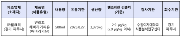 식품의약품안전처는 식품제조가공업체인 ‘㈜웰크리(경기 파주시)’가 제조∙판매한 ‘엔리끄 해바라기씨유(식품유형: 해바라기유)’에서 벤조피렌이 기준치보다 초과 검출되어 경기 파주시
