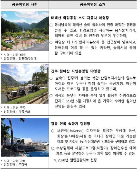 분야별 대표 선정사례를 보면 ▴가족 친화 야영장으로는 목공체험, 어린이 도서관 프로그램 등을 운영하고 있는 ‘진주 월아산 자연휴양림 야영장’이 선정됐다. ▴무장애 야영장으로는 강원도 강릉의 ‘연곡해변 솔향기 캠핑장’이 선정되었는데, 이곳은 장애인이 이용할 수 있는 데크가 설치되어 있고, 장애인 우선 예약제도를 운영하는 등 장애인이 편리하게 이용할 수 있는 시설을 구비하고 있다. ▴반려동물 친화 야영장으로는 반려견 산책로와 수영장, 체육관 등 우수한 반려동물 특화 부대시설을 보유한 ‘라이프위드도그 캠핑장’이 선정됐다. ▴친환경 야영장으로는 산림치유 프로그램 등을 운영하고 캠핑카 오폐수 처리시설인 덤프스테이션을 갖추고 있는 ‘백운산 자연휴양림 야영장’이 선정됐다.