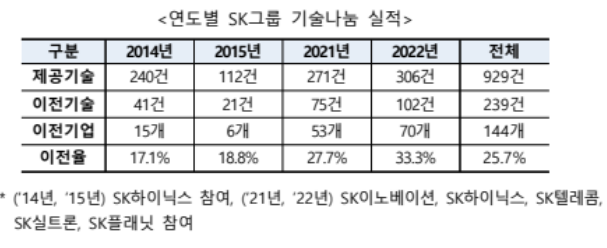 SK그룹은 중소기업과의 동반성장을 적극적으로 실천하기 위하여 기술 나눔에 가장 먼저 참여한 대기업으로 2014년부터 지난해까지 144개 기업에 239건의 기술을 무료로 나눠주었다.