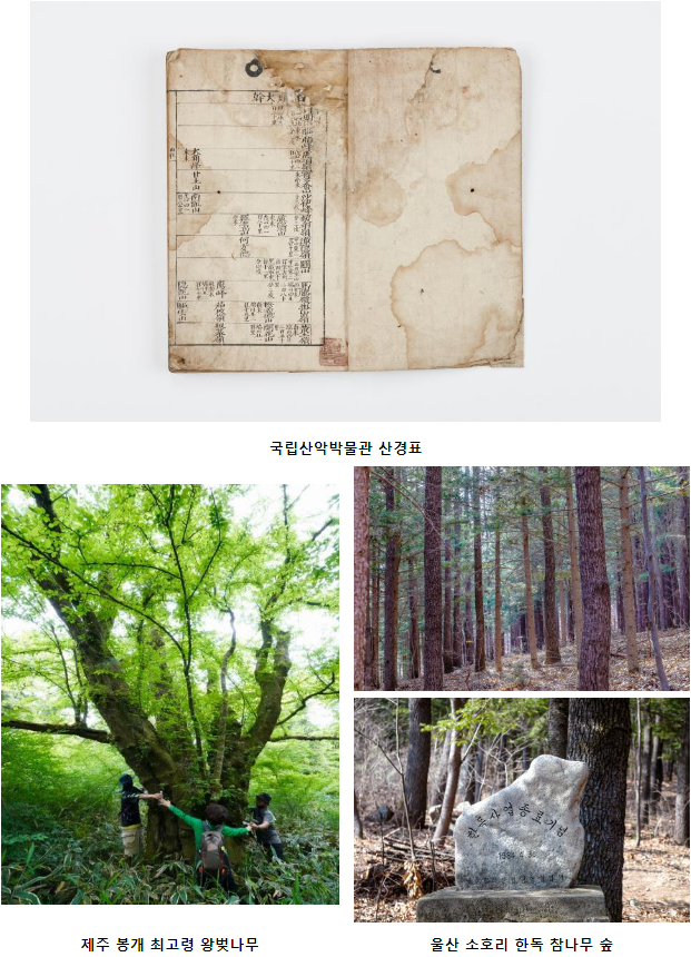 특히, 올해 지정된 국립산악박물관의‘산경표’는 우리나라 산줄기를 대간, 정간, 정맥으로 구분하여 족보형식으로 기록한 초기 필사본이며, 제주 봉개 최고령 왕벚나무는 265년생으로 우리나라 자생 왕벚나무 중 가장 최고령으로 추정되어 보존가치가 매우 높다. 또한, 울산 소호리 한독 참나무숲은 내년 한·독 임업기술협력 50주년을 맞는 대상지로 독일의 지원에 힘입어 산림녹화에 성공한 한국의 국제협력 성공사례를 보여주어 큰 의미가 있다.