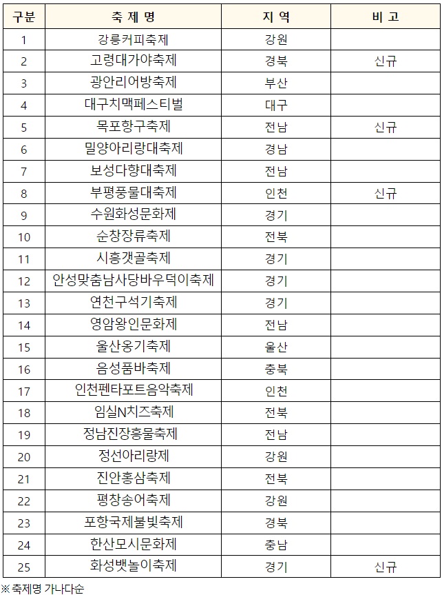 문화체육관광부(이하 문체부)는 ‘2024-2025 문화관광축제’ 25개를 최종 발표했다. 선정 결과, 기존 ’20~’23 문화관광축제 중 21개 축제를 재지정하고, 고령대가야축제, 목포항구축제, 부평풍물대축제, 화성뱃놀이축제 등 총 4개 축제를 새롭게 문화관광축제로 지정했다.