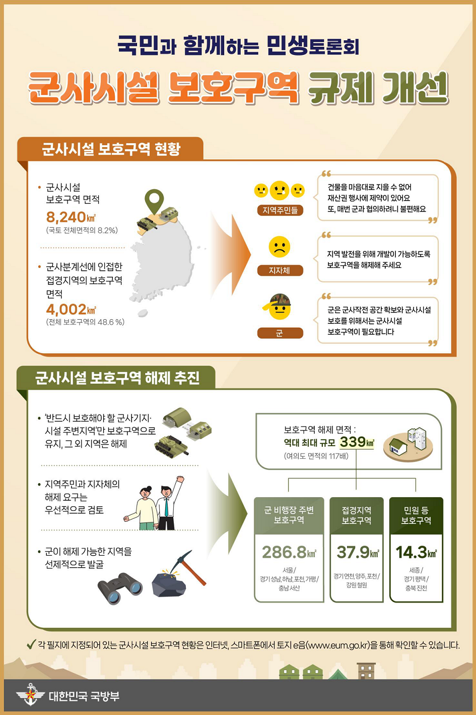 국방부는 군사시설보호구역(이하 ‘보호구역’) 339㎢를 해제한다.이는 ’07년 「군사기지 및 군사시설보호법」이 제정된 이래 최대규모의 보호구역 해제로, ▴군 비행장 주변 287㎢, ▴작전에