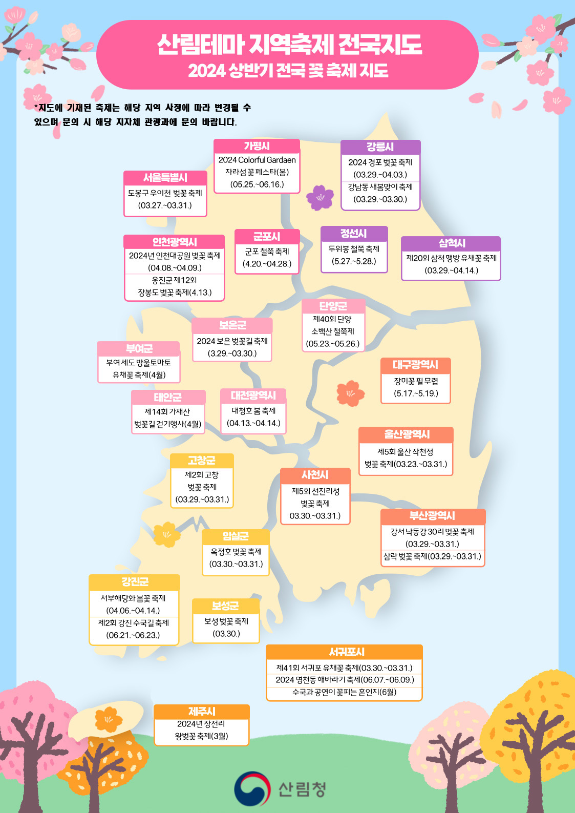산림청은 본격적인 지역축제 개최에 앞서 ‘산림테마 지역축제 전국지도’를 제작해 올해 상반기 동안 산림과 관련된 지역축제 정보를 제공한다. 대표적으로 3~4월에는 대전 대청호 봄축제와 서귀포 유채꽃 축제, 5∼6월에는 담양 대나무 축제와 영양 산나물 축제 등이 예정되어 있다.