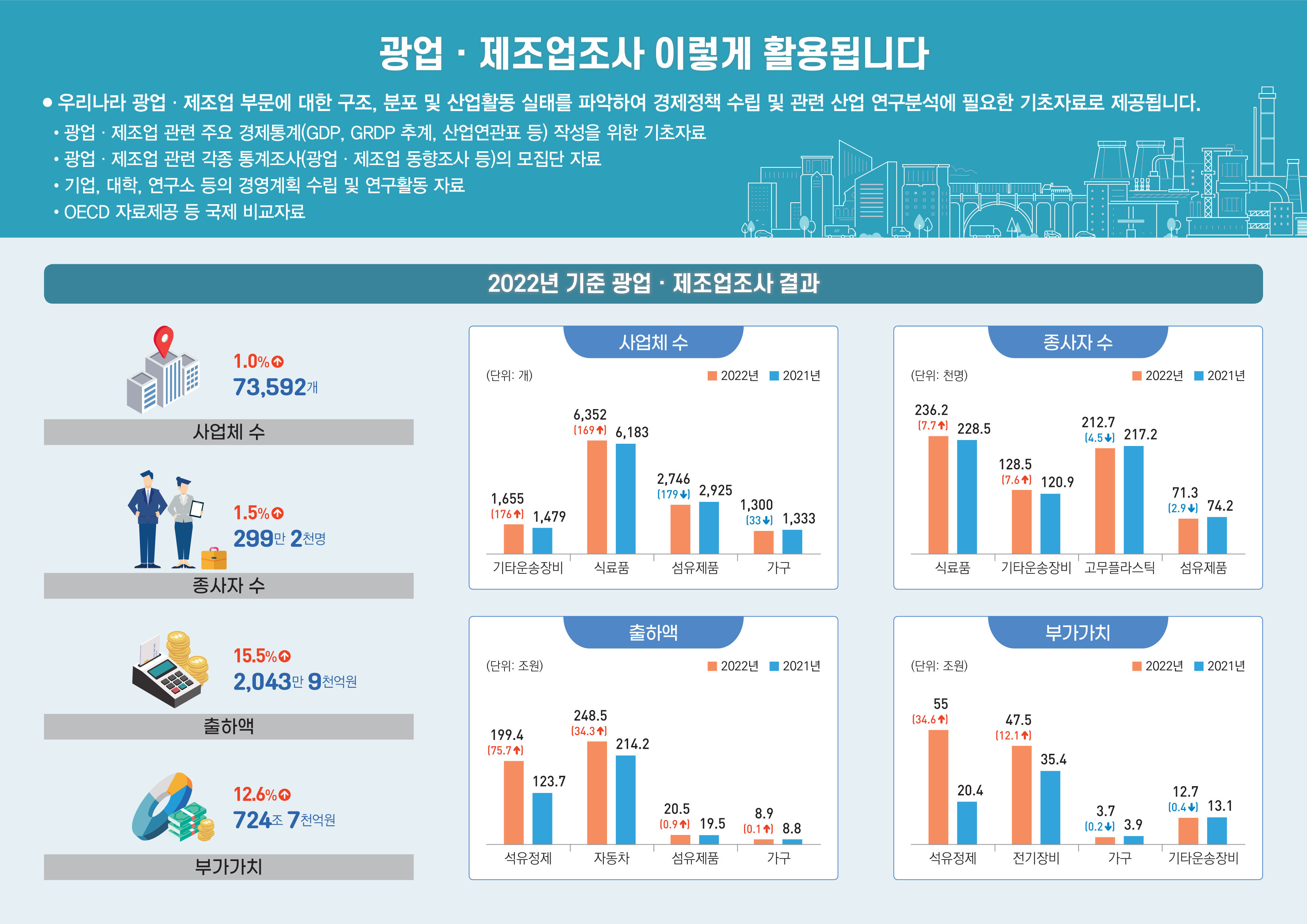 올해 실시한 광업·제조업조사 결과는 통계청에서 2024년 12월 말 잠정적으로 공표, 2025년 1월에 최종결과가 확정되고 국가통계포털(KOSIS)에 수록된다.