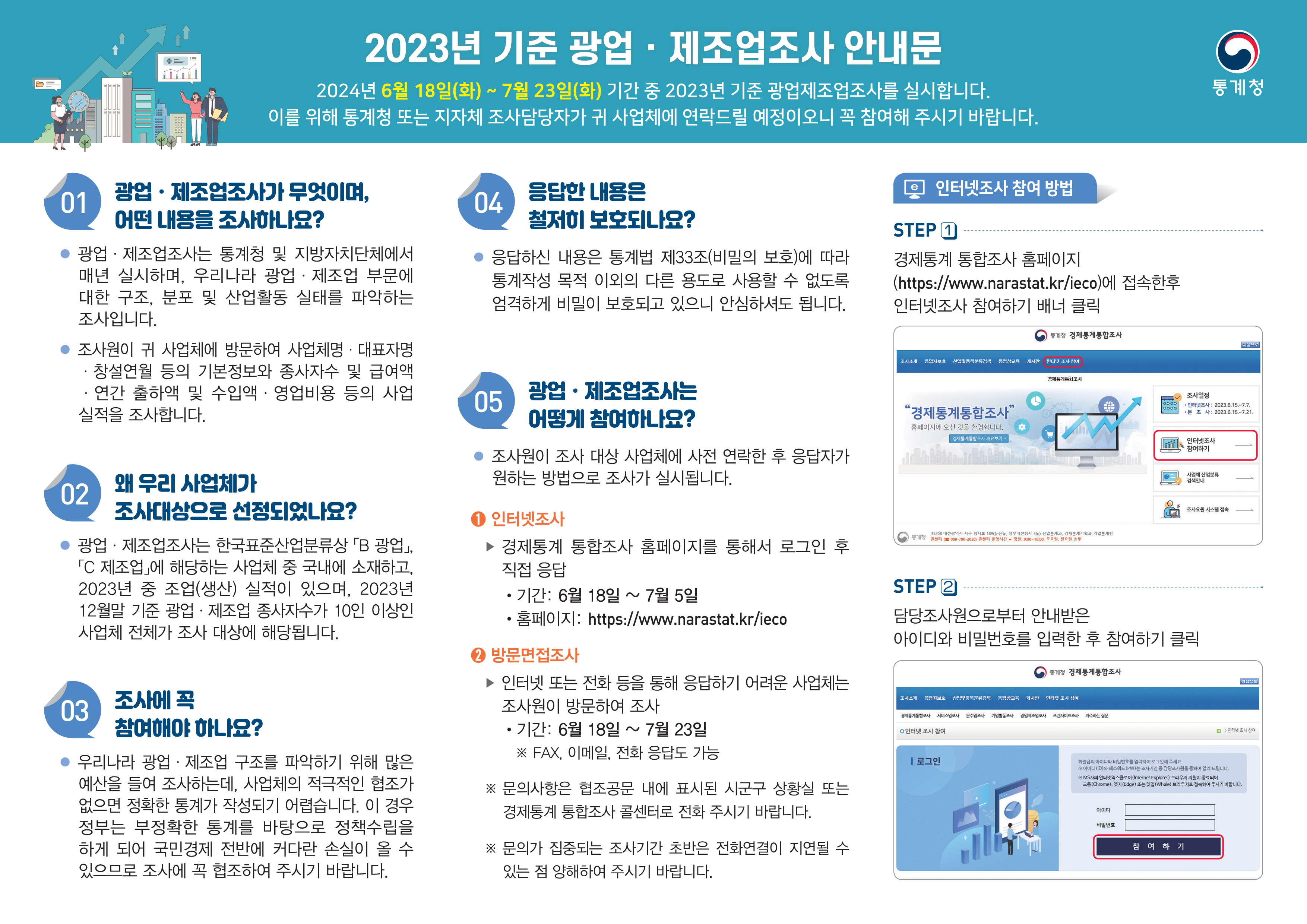인터넷조사는 2024. 6. 18. ~ 7. 5.까지 http://www.narastat.kr/ieco에서 참여할 수 있다.