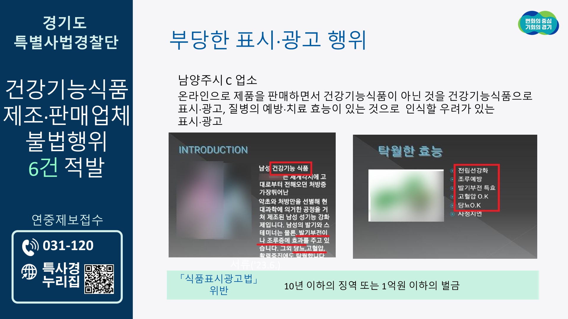 경기도 특별사법경찰단은 건강기능식품 제조·판매업체 불법행위를 수사해 미신고 판매, 부당한 표시·광고 행위 등 총 6건을 적발했다고 7일 밝혔다.