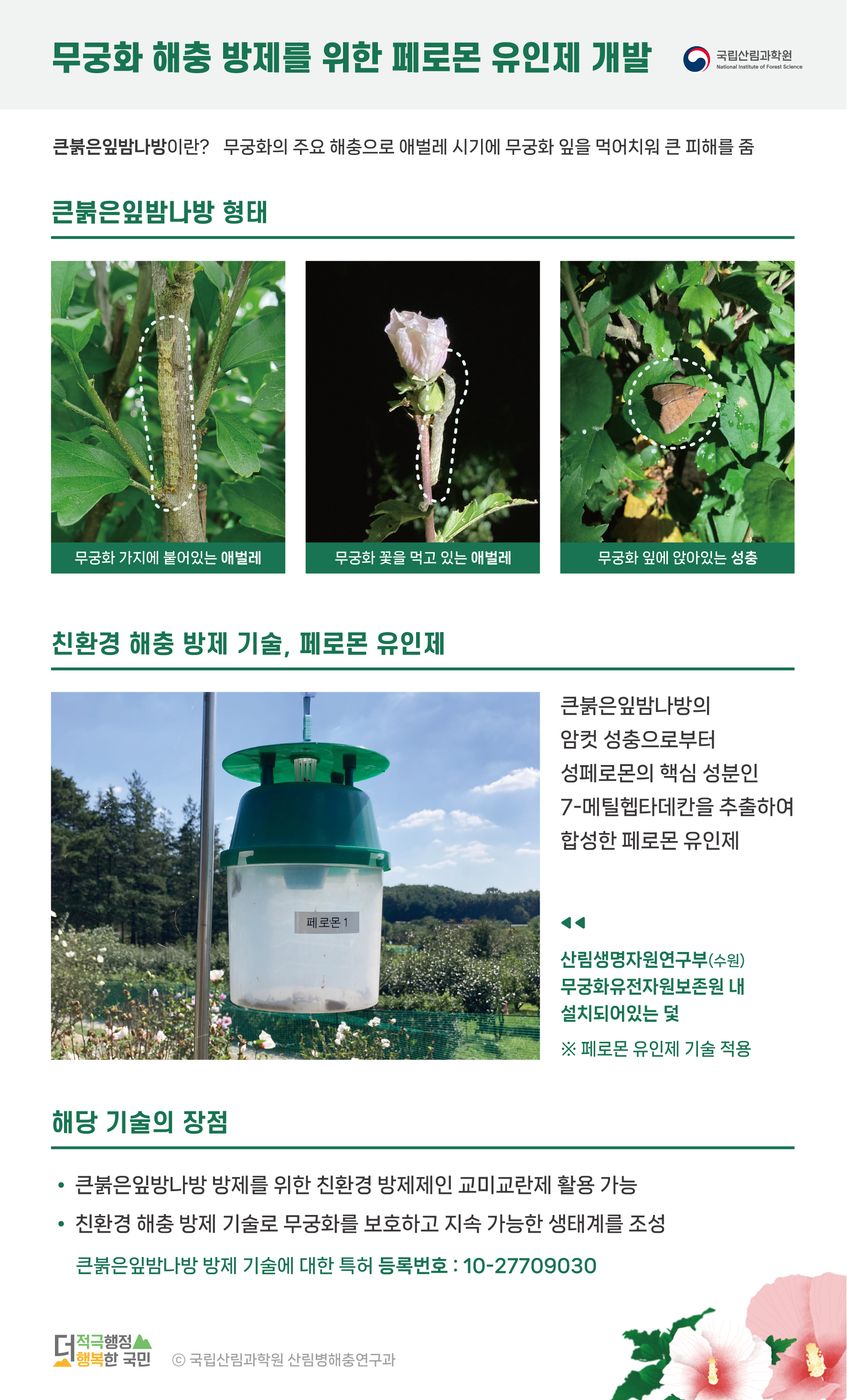 국립산림과학원이 나라꽃인 무궁화의 주요 해충인 큰붉은잎밤나방(왕붉은잎큰나방, Rusicada privata)의 방제를 위한 친환경 페로몬 유인제 개발에 성공했다고 밝혔다. 이번 기술은 해충의 성페로몬을 합성하여 자연적인 방법으로 해충을 유인, 화학 농약 없이도 무궁화를 효과적으로 보호할 수 있는 혁신적인 방제 기술로 주목받고 있다.