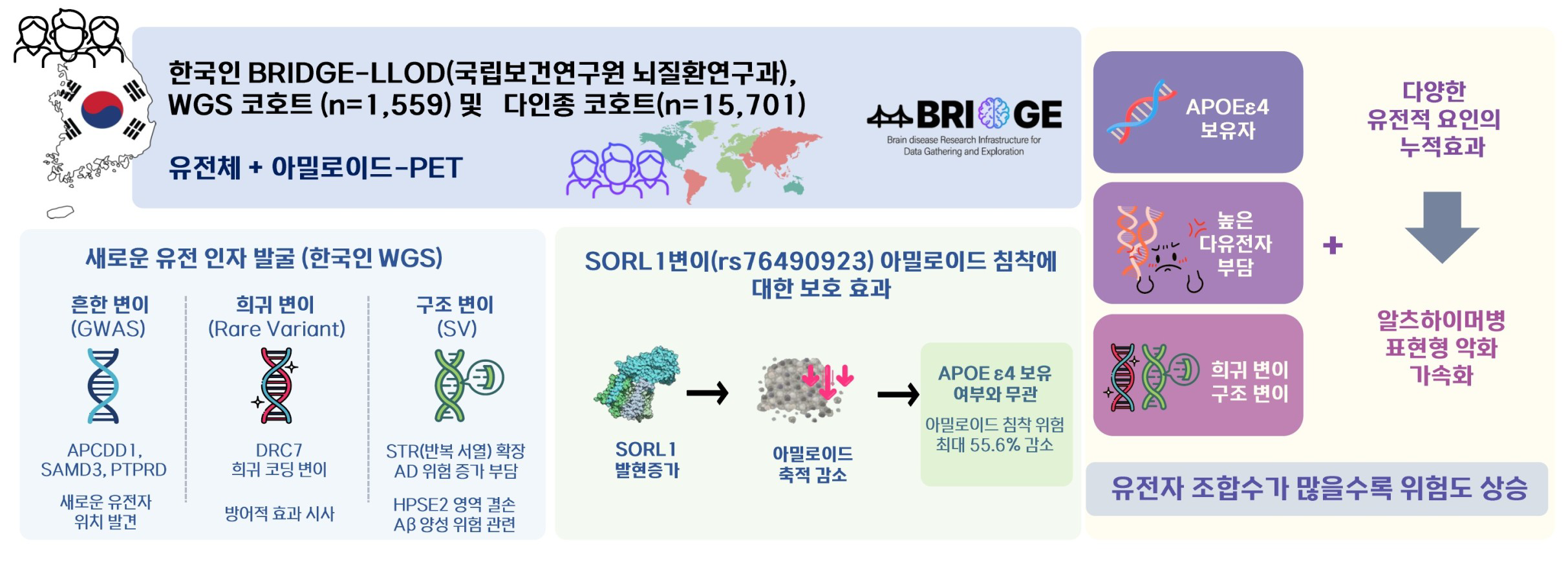 이번 연구는 질병관리청의 ‘뇌질환 연구기반 조성 연구사업(BRIDGE)’의 일환으로, 한국인 노인성 치매환자 코호트(BRIDGE-LLOD)의 유전정보와 아밀로이드 PET 뇌영상 자료를 함께 분석했다. 그 결과 SORL1, APCDD1, DRC7 등 새로운 발병 관련 유전자가 확인됐으며, 이들 중 일부는 알츠하이머병의 주요 원인으로 알려진 베타 아밀로이드 단백질 축적을 억제하는 보호 효과를 갖는 것으로 밝혀졌다.