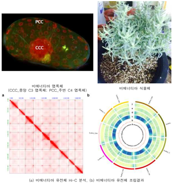 연구진은 2018년부터 비에너티아의 분자적 광합성 메커니즘을 밝히기 위해 유전체 분석을 진행해 총 9개 염색체, 3.61Gb 규모의 염색체 수준 유전체 지도를 구축했다. 이 과정에서 4만 465개의 단백질 암호화 유전자가 주석화됐으며, 높은 완성도 지표를 바탕으로 해당 유전체는 단일세포 C4 광합성 연구의 표준 자료로 인정받았다. 사람 유전체보다 약 1.18배 크고 유전자는 두 배 이상 많아 생리·대사적 적응을 뒷받침하는 폭넓은 유전 기반을 갖춘 것으로 평가된다.