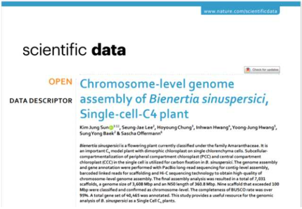 연구진은 2018년부터 비에너티아의 분자적 광합성 메커니즘을 밝히기 위해 유전체 분석을 진행해 총 9개 염색체, 3.61Gb 규모의 염색체 수준 유전체 지도를 구축했다. 이 과정에서 4만 465개의 단백질 암호화 유전자가 주석화됐으며, 높은 완성도 지표를 바탕으로 해당 유전체는 단일세포 C4 광합성 연구의 표준 자료로 인정받았다. 사람 유전체보다 약 1.18배 크고 유전자는 두 배 이상 많아 생리·대사적 적응을 뒷받침하는 폭넓은 유전 기반을 갖춘 것으로 평가된다.