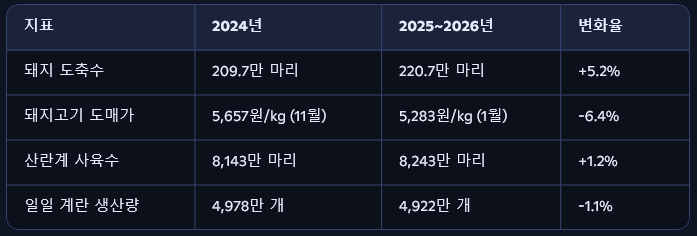 농식품부는 현재 돼지고기와 계란 수급이 안정적이라고 설명했다. 돼지 도축 마릿수는 지난해 같은 기간 대비 5.2% 증가한 220만 마리로 집계됐으며, 돼지고기 도매가는 11월 5,657원/kg에서 1월 5,283원/kg으로 6.4% 하락했다. 계란은 산란계 사육 마릿수가 8,243만 마리로 전년 대비 1.2% 늘었고, 일일 생산량은 4,922만 개로 전년 수준을 유지했다.