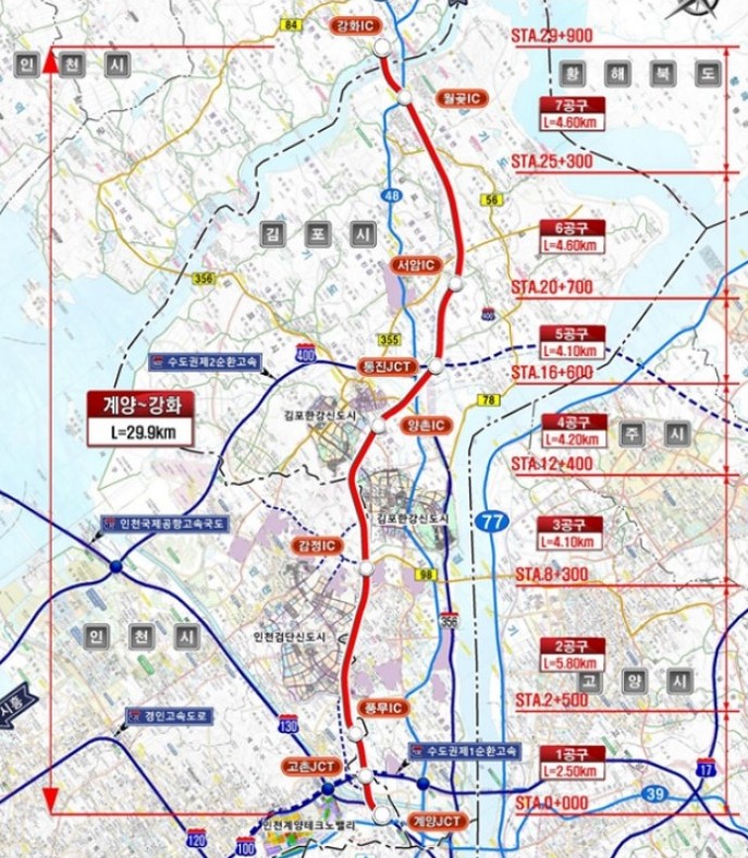 이번 사업은 인천 계양구 상야동에서 김포시를 거쳐 강화군 선원면 신정리까지 이어지는 총 연장 29.88km, 왕복 4~6차로 규모의 국가 간선도로망으로, 총사업비 약 2조 9,152억 원이 투입된다. 준공 목표는 2032년 하반기다.