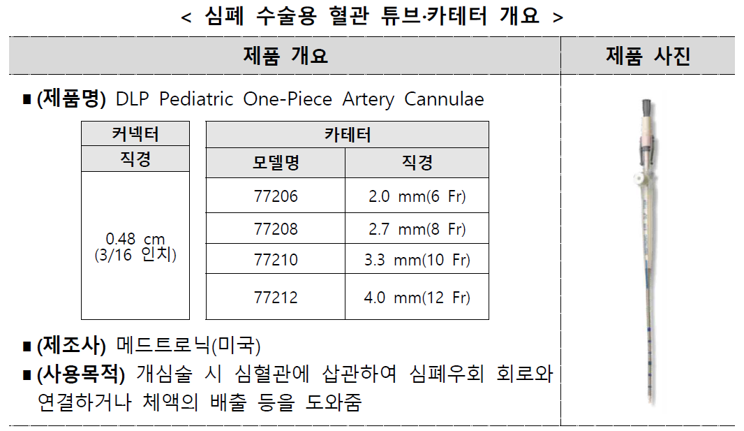 이번에 지정한 제품은 심폐우회술(개심술을 안전하고 효율적으로 시행하기 위해 심장과 폐의 기능을 기계장치로 일시적으로 우회시켜 주는 수술기법) 시 심혈관에 삽입하는 ‘카테터(혈관 내 약액 주입, 압력측정, 좁아진 부위 확장 등에 사용하는 긴 튜브 형태의 의료기기)’로 인공심폐기와 연결하기 위한 ‘커넥터’가 합쳐진 제품이다.