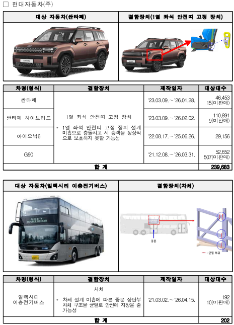현대 싼타페 등 4개 차종 239,683대는 1열 좌석 안전띠 고정 장치 설계 미흡으로 충돌 시 승객 보호가 제대로 이뤄지지 않을 가능성이 있어 6월 4일부터 시정조치가 시작된다. 이는 미국 등 글로벌 리콜과 동일한 사안이다. 또한 일렉시티 이층버스 202대는 차체 구조물 균열 가능성이 확인돼 4월 20일부터 리콜이 진행 중이다.