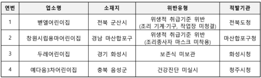 식약처, 어린이집 위생점검 결과 4곳 적발 - 미디어 바로 식약처, 어린이집 위생점검 결과 4곳 적발 - 미디어 바로식품의약품안전처는 영유아 급식시설의 식중독 예방을 위해 전국 어린이집 집단급식소 3,892곳을 점검한 결과, 식품위생법을 위반한 4곳을 적발해 관할 지자체에 행정처분을 요청했다고 밝혔다.www.mediabaro.com 총 3,892곳 점검…조리용 기계‧기구 청결관리 미흡 등 4곳 적발 식품의약품안전처는 영유아 급식시설의 식중독 예방을 위해 전국 어린이집 집단급식소 3,892곳을 점검한 결과, 식품위생법을 위반한 4곳을 적발해 관할 지자체에 행정처분을 요청했다고 밝혔다. 이번 점검은 17개 지방자치단체와 함께 10월 13일부터 31일까지 실시됐으며, 조리식품과 조리기구 등에 대한 수거·검사..