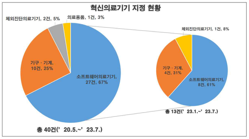 ’23년 혁신의료기기 지정 제품 61%가 소프트웨어 - 미디어 바로 (mediabaro.com) ’23년 혁신의료기기 지정 제품 61%가 소프트웨어 - 미디어 바로 식품의약품안전처는 올해 7월까지 빅데이터·인공지능(AI)·웨어러블·모바일앱·가상현실(VR) 등 디지털헬스기술을 활용한 디지털치료기기 등 13개 제품을 혁신의료기기(정보통신기술, 생명공학 www.mediabaro.com 올해 7월까지 13개 중 소프트웨어 8개, 기구·기계류 4개, 체외진단 1개 제도 시행 이후 165개 제품 신청, 40개 지정 식품의약품안전처는 올해 7월까지 빅데이터·인공지능(AI)·웨어러블·모바일앱·가상현실(VR) 등 디지털헬스기술을 활용한 디지털치료기기 등 13개 제품을 혁신의료기기(정보통신기술, 생명공학기술, 로봇기술 등..