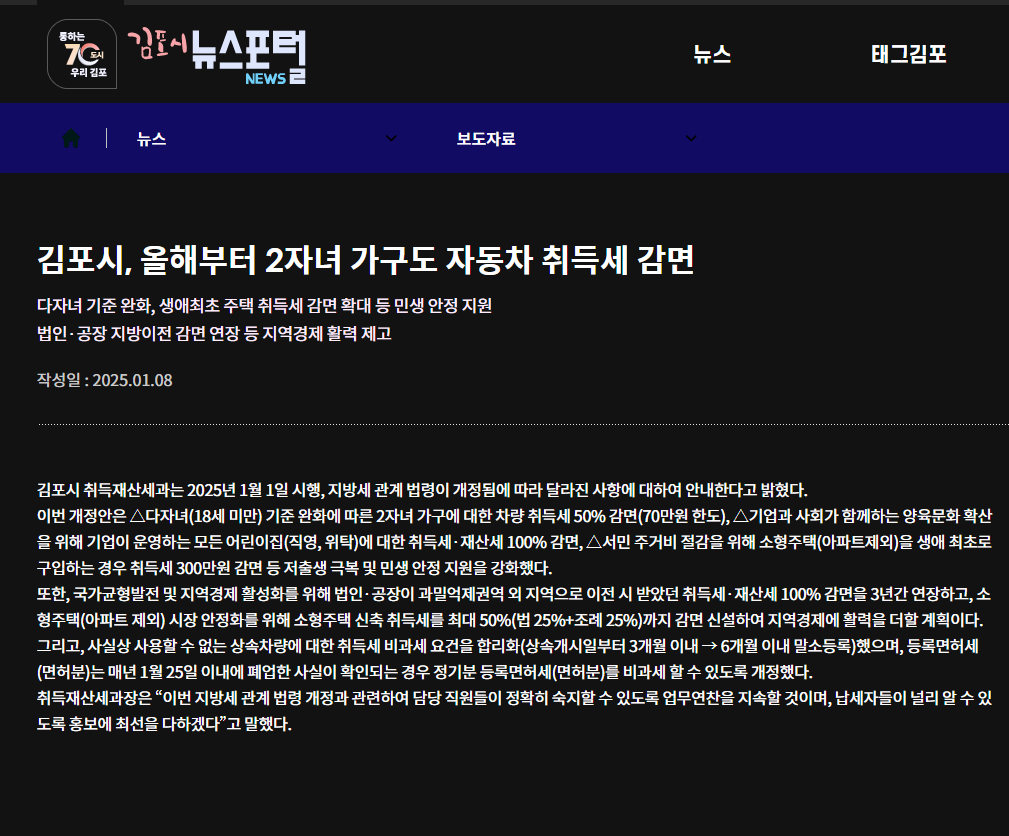 1월 8일 자 김포시 뉴스포털 보도자료 보도자료 - 김포시뉴스포털보도자료 - 김포시뉴스포털www.gimpo.go.kr 김포시 취득세 개정안, 실효성 논란 김포시가 2025년부터 시행하는 취득세 개정안이 발표되었다. 개정안의 주요 내용은 2자녀 가구에 대한 자동차 취득세 감면, 어린이집 취득세·재산세 면제, 생애 최초 주택 취득세 감면 등 다양한 혜택을 포함하고 있다. 그러나 이러한 정책들이 실제로 민생 안정에 얼마나 기여할 수 있을지에 대한 의문이 제기되고 있다. 특히, 개정안은 통계적 근거와 수요 예측이 부족한 상태에서 발표되었고, 이는 정책의 실효성에 큰 의문을 남기고 있다. 2자녀 가구의 자동차 취득세 감면, 과연 필요한가?김포시는 올해부터 2자녀 가구에 대해 자동차 취득세 50% 감면 혜..