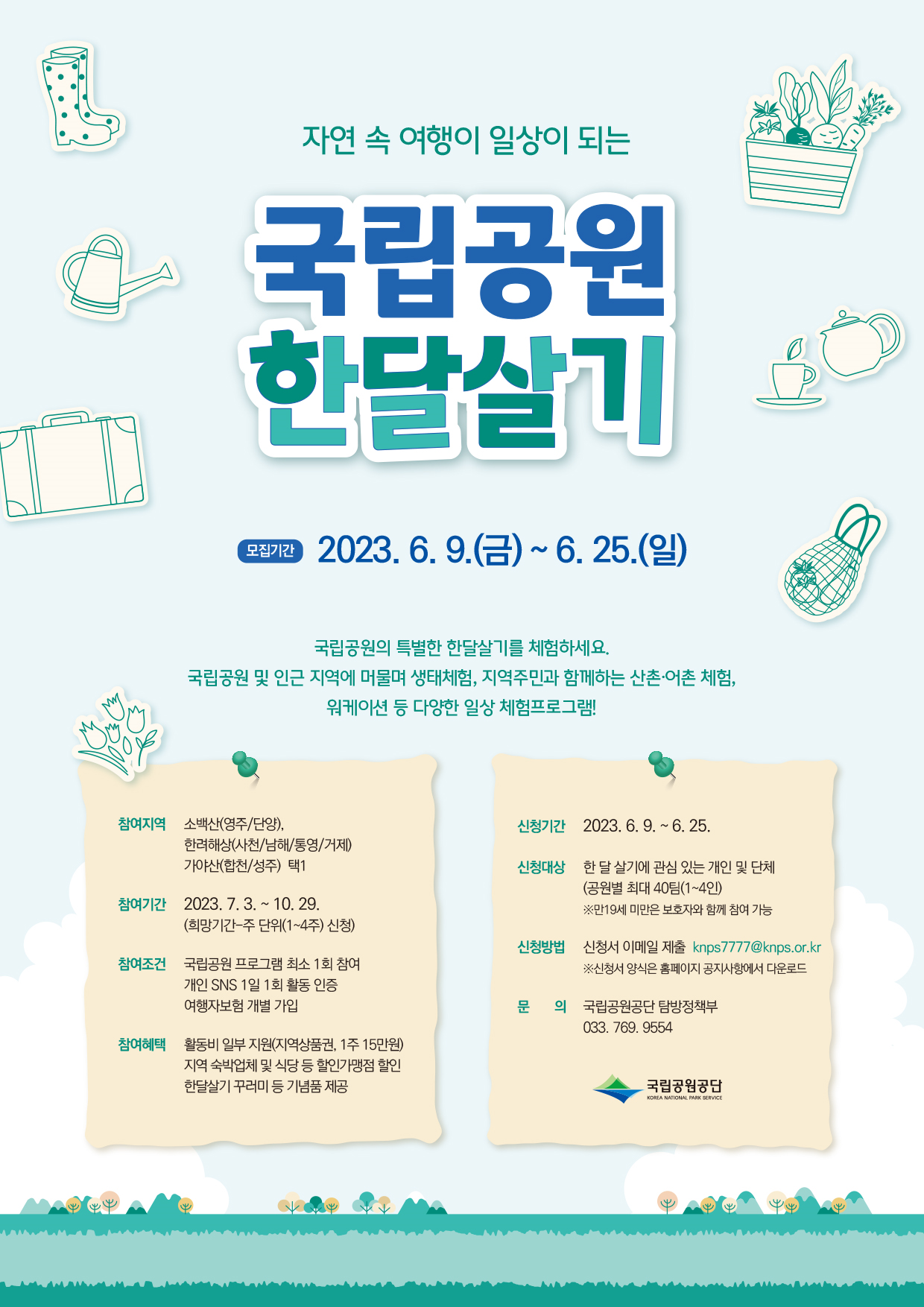 국립공원 한 달 살기… 참가자 모집 - 미디어 바로 환경부 산하 국립공원공단은 지역 체류형 여행에 관심 있는 탐방객을 대상으로 ‘국립공원 한 달 살기’ 참여자를 6월 9일부터 25일까지 모집한다.‘국립공원 한 달 살기’는 국내 여행 활성화 www.mediabaro.com 국립공원별 특색있는 주제, 정보 제공 환경부 산하 국립공원공단은 지역 체류형 여행에 관심 있는 탐방객을 대상으로 ‘국립공원 한 달 살기’ 참여자를 6월 9일부터 25일까지 모집한다. ‘국립공원 한 달 살기’는 국내 여행 활성화를 위해 소백산, 한려해상, 가야산 등 3곳의 국립공원에서 진행한다. 친환경 산촌생활 등 한 달 살기에 도움이 되는 지역 관광자원 정보(‘친환경 산촌생활(소백산)’, ‘섬·바다에서 삼시세끼(한려해상)’, ‘자연 속에..