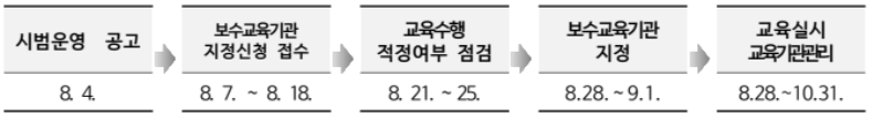 추진일정보건복지부는 요양보호사의 전문성을 강화하고 서비스 질을 향상시키기 위해 8월부터 10월까지 3개월간 부산, 대구, 울산, 경북, 경남 5개 시·도를 대상으로 요양보호사 보수교육을 시