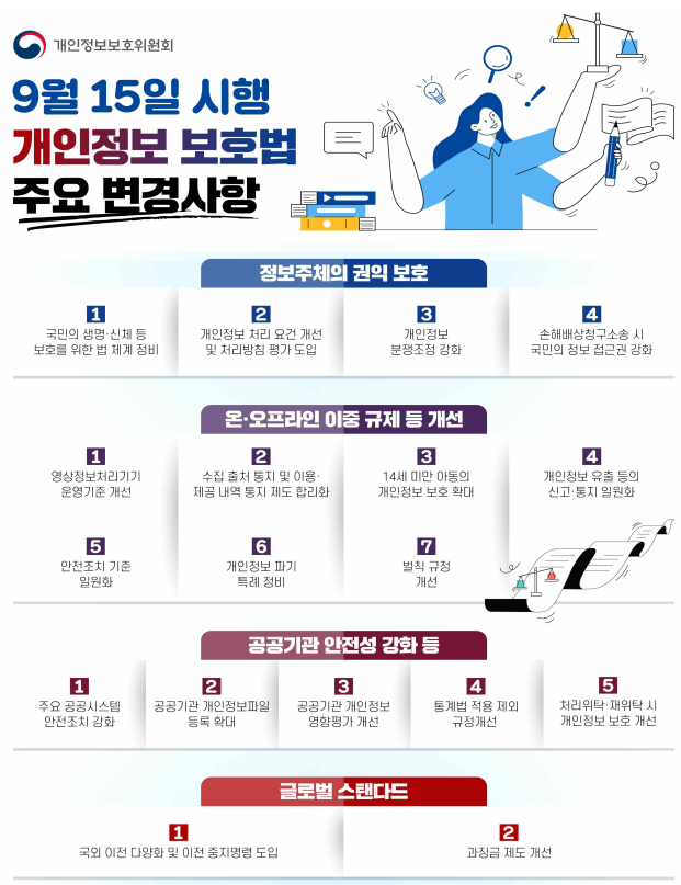 9월 15일 시행되는 개정법에는 정보주체인 국민의 권리는 실질적으로 보장하면서 온라인-오프라인으로 이원화되어 있는 개인정보 처리 기준을 디지털 환경에 맞게 일원화하는 등 그동안 각 계에서 논의되어 온 다양한 내용이 포함되어 있다.