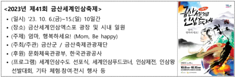 특히 올해는 10월 6일부터 15일까지 열리는 ‘금산 세계인삼축제’를 시범사업으로 선정, 백종원 더본코리아 대표와 협업해 ‘착한 가격’으로 다양한 먹거리를 즐길 수 있는 축제로 만든다. 백종원 대표는 지역음식에 대한 높은 관심과 애정으로 예산 등 전통시장의 먹거리를 개선해 많은 호응을 얻은 바 있다.
