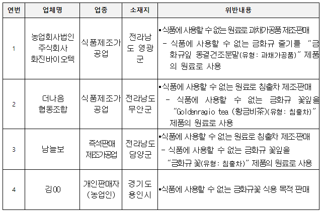 식품에 사용할 수 없는 금화규 꽃·줄기를 사용한 업체 4곳 적발‧조치