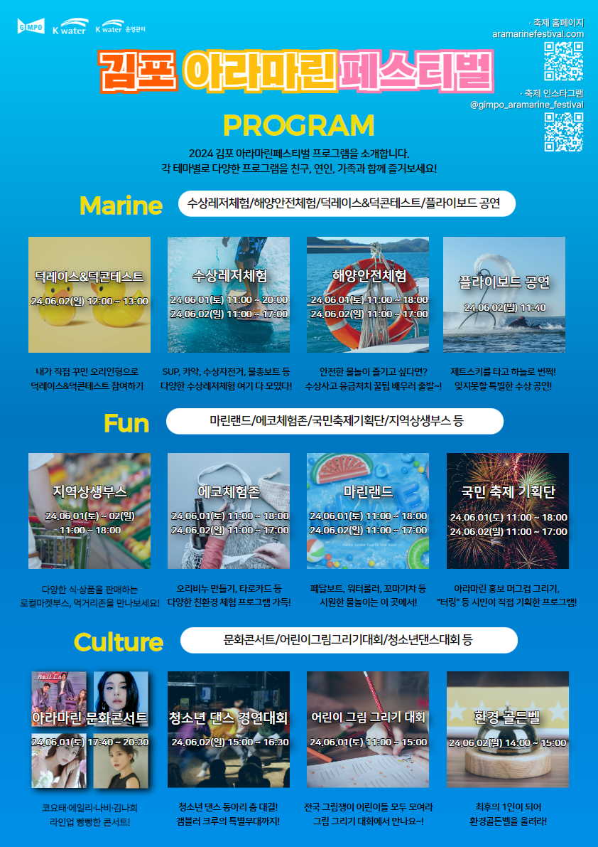 ‘2024 김포 아라마린 페스티벌’은 올해 제8회를 맞은 김포시의 대표적인 축제다. 이번 페스티벌에서는 오직 아라마린에서만 경험할 수 있는 △장난기 가득한 덕 레이싱 △가족이 함께 즐길 수 있는 수상 레저 체험 △마린랜드에서의 물놀이 △다채로운 문화 콘서트 △생태 체험 부스 및 다양한 이벤트 등이 준비되어 있어 남녀노소 모두가 즐길 수 있는 축제이다.