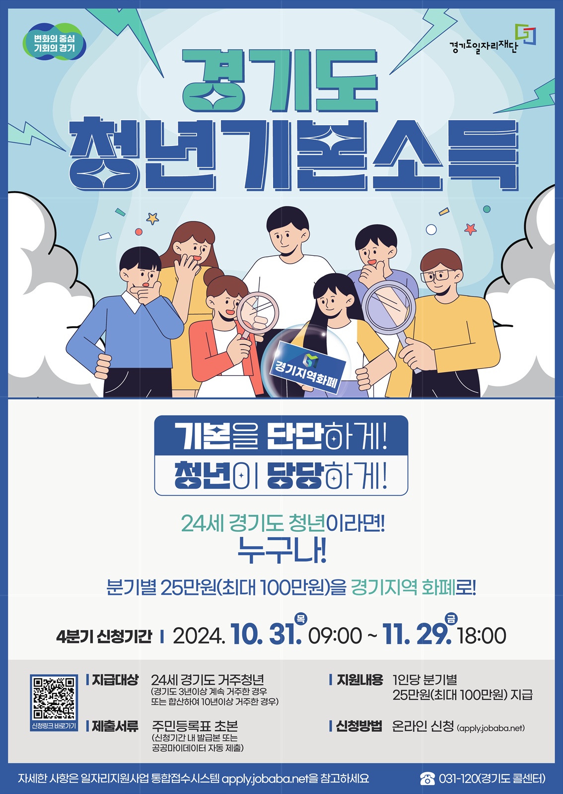 경기도가 24세 청년에게 분기별로 25만 원(최대 100만 원)을 지급하는 ‘청년기본소득’ 2024년 4분기 신청자를 10월 31일 오전 9시부터 11월 29일 오후 6시까지 모집한다.