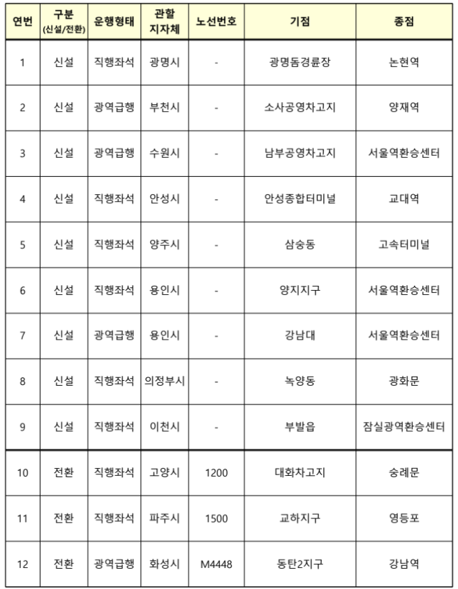 신규 노선은 경기 광명, 부천, 수원, 안성, 양주, 용인 2개, 의정부, 이천 등 8개 지역에서 서울 주요 거점으로 향하는 총 9개 노선이다. 해당 노선들은 운송사업자 선정, 면허 발급, 차량 확보 등의 절차를 거쳐 내년 중 운행에 돌입할 예정이다.