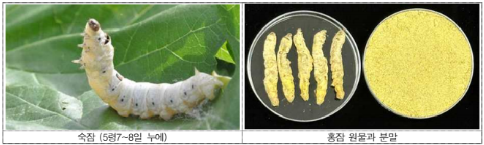 홍잠은 단백질 함량이 최고조에 이르는 시기의 누에를 찌고 동결 건조해 만든 것으로, 전체 성분 중 70% 이상이 단백질로 구성돼 있다. 특히 글리신, 세린, 알라닌 등 아미노산이 풍부하며, 지방 성분도 주로 리놀렌산·올레산 등 불포화지방산으로 이뤄져 있는 것이 특징이다.