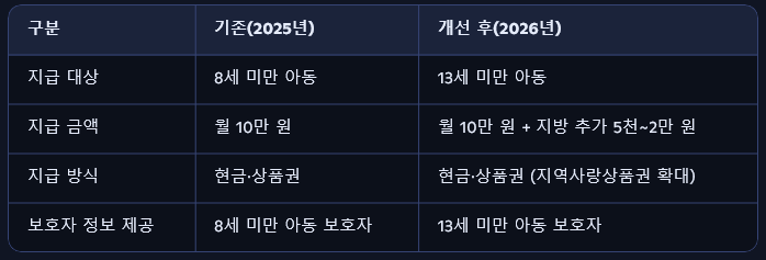 8세 미만 → 13세 미만 아동까지 단계적 확대, 지방 거주 아동은 추가 지급