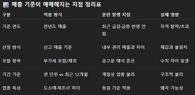 전년도 매출을 보는지, 최근 12개월을 보는지, 반기 기준을 적용하는지에 따라 판단이 달라진다.